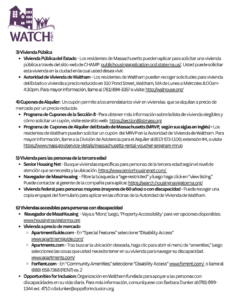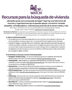 WATCH no es propietaria ni administra viviendas asequibles y no proporciona vivienda ni refugio. Tampoco ofrecemos cuidado infantil ni transporte.