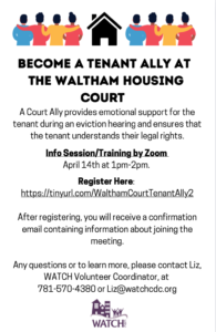 WATCH is looking for volunteers to be a part of our Court Ally program. A Court Ally provides emotional support for the tenant during an eviction hearing and ensures that the tenant understands their legal rights.