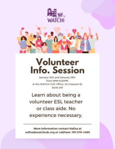 El 25 de enero a las 12:00-1:30PM en la oficina de WATCH CDC, 24 Crescent St., Suite 201, Waltham