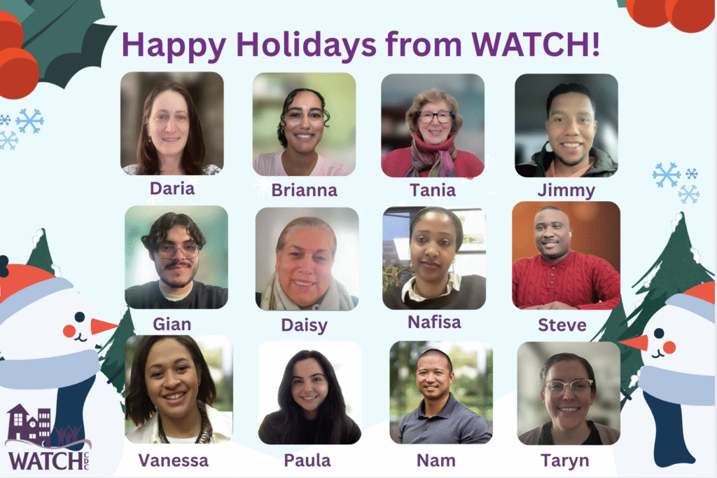 WATCH estará cerrado del 24 de diciembre al 1 de enero para que nuestro personal disfrute de un merecido descanso. La oficina de WATCH volverá a abrir el viernes 2 de enero de 2026. ¡Les deseamos a ustedes y a sus familias unas felices fiestas y un próspero año nuevo!